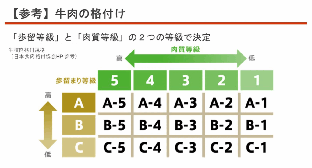 • 1〜5:肉質等級(脂肪交雑=サシ、色沢、締まりなど)
